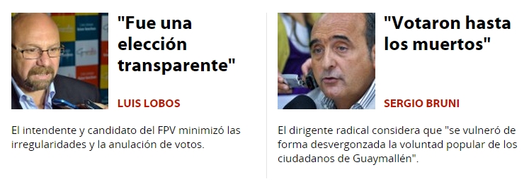 «El Frente Para la Victoria, en su afán por no perder el poder ha llegado a límites irreconciliables con la república, vulnerando de forma desvergonzada la voluntad popular de los ciudadanos de Guaymallén, donde de la noche a la mañana se perdieron nueve mil sufragios, a raíz de un acto eleccionario dónde no faltó nada…. boletas truchas, urnas vacías, urnas sin actas, urnas con más votos que votantes, y mesas sin telegramas.“Votaron hasta los muertos”, dicen los vecinos de Guayamallén, y donde el Concejal a cargo de la Intendencia Lobos, se copió de los dirigentes que generaron la denominada década infame, en la Argentina de principios del siglo XX.